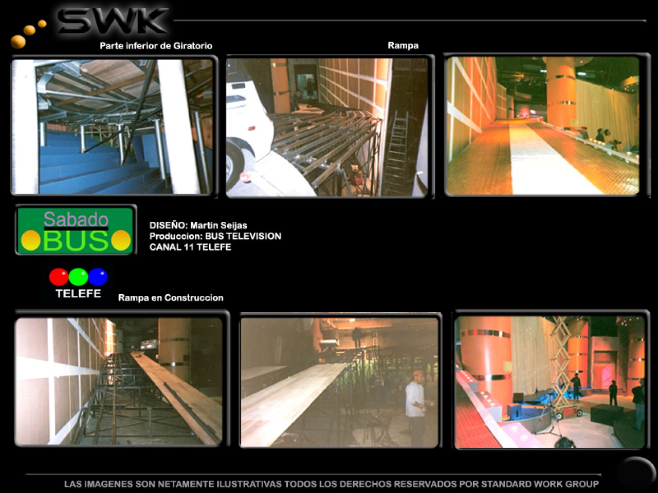 Escenografia completa para SABADO BUS. Rampa de 24 mts de largo de 0 a 4 mts de altura. Giratorio de 8 mts de diametro, todo controlado por PLC y manejado por control. Este trabajo se desarrollo en el estudio D de Television Federal (TE LE FE)