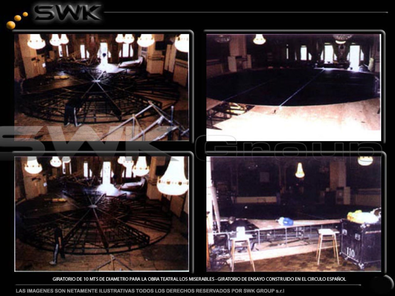 Giratorio de 10 mts de diametro fabricado en acero con giro a ambos lados y parada exactas para entrada de carros escenograficos. Se construyo un giratorio de ensayo en el club Español, mientras se armada en el teatro Opera el giratorio original. Todo controlado por PLC.